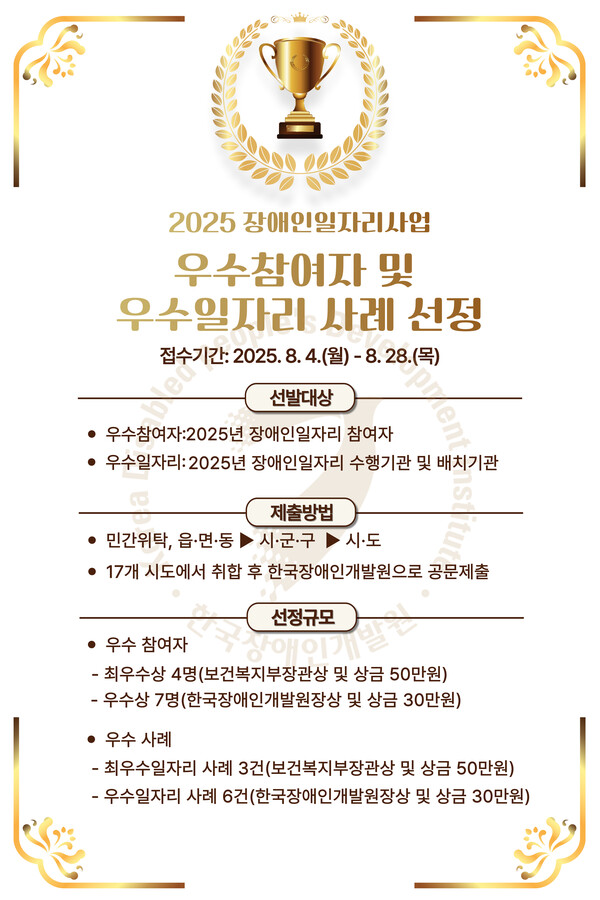 정하림 기자 : 보건복지부(장관 정은경)와 한국장애인개발원(원장 이경혜, 이하 개발원)은 오는 8월 28일까지 ‘2025년 장애인일자리사업 우수참여자 및 우수일자리 사례’ 공모를 진행한다고 5일 밝혔다.
