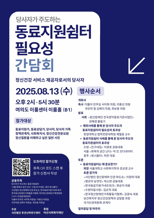 토론회에서는 정신건강 분야 전문가와 활동가, 당사자, 정책담당자 등 다양한 주체들이 참석해 동료지원 모델의 확대 가능성과 제도화를 위한 논의를 이어갈 예정이다.