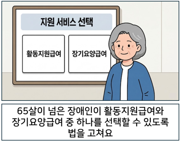 65살이 넘은 장애인이 '활동지원급여'와 '장기요양급여' 중 하나를 선택할 수 있도록 법을 고쳐요
