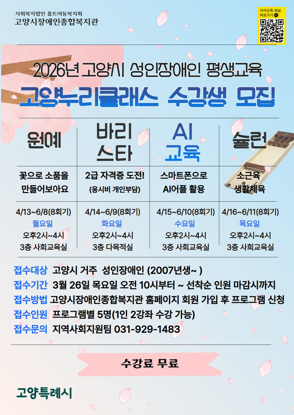 이번 교육은 고양시에 거주하는 성인장애인을 대상으로 운영되며 모든 프로그램은 무료로 제공된다. 상반기 교육은 2026년 4월부터 6월까지 진행될 예정이다.