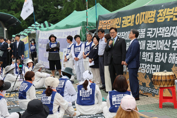부모연대는 지난달 16일부터 발달장애인 추경 예산을 요구하며 국회 정문 앞에서 매일 100배 제자리 오체투지를 진행해왔다. 또 이재명 대통령의 공약이기도 한 '발달·정신장애인 국가책임제'를 주요 국정과제에 반영해달라고 요구해왔다.