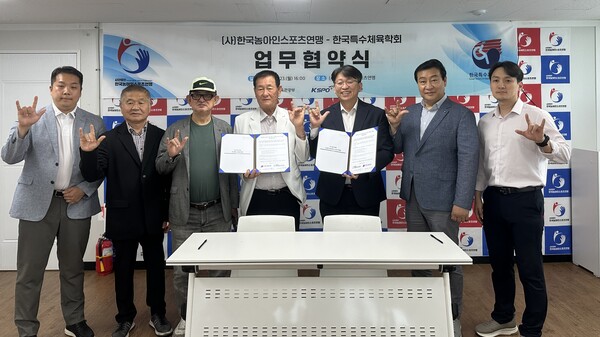 협약식에는 한국농아인스포츠연맹 이종학 회장을 비롯해 정상화 수석부회장, 정봉규 사무국장, 한국특수체육학회 이재원 회장, 안승옥 사무국장이 참석했다.
