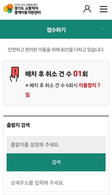 ‘배차 후 취소 건수 누적 시 이용 제한 경고. ©경기도교통약자광역이동지원센터 앱