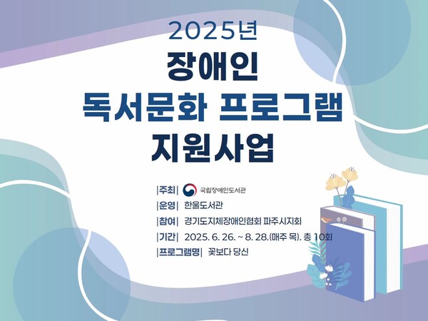 전성환 기자 : 파주시 한울도서관이 국립장애인도서관의 지원을 받아 6월 26일부터 8월 28일까지 성인 지체장애인을 위한 독서문화 프로그램 ‘꽃보다 당신’을 운영한다.