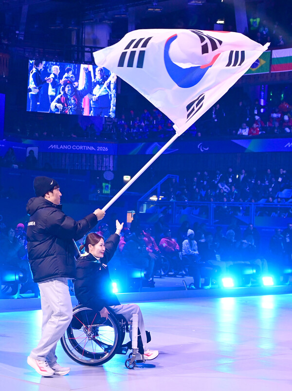 2026 밀라노·코르티나담페초 동계패럴림픽이 10일간의 뜨거웠던 열전을 뒤로하고 대단원의 막을 내렸다. 15일 오후(현지시간) 이탈리아 코르티나 컬링 올림픽 스타디움에서 열린 폐회식에서 스노보드의 이제혁과 휠체어컬링 믹스더블의 백혜진이 태극기를 들고 입장하고 있다. ©대한장애인체육회