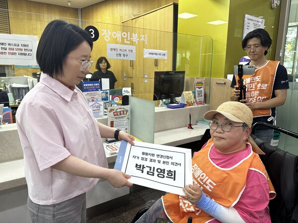 박김 상임대표는 "중증장애가 있다는 이유만으로 활동지원서비스 평가할 때 내가 얼마나 무능한지, 뭘 할 수 없는지 끊임없이 말하며 비참한 기분을 느낀다. 그렇다고 내 말이 충분히 반영되는 것도 아니"라면서 "그들이 만든 기준에 부합돼야만 나의 일상이 보장되는 현실 앞에서 좌절을 느낀다"고 토로했다.