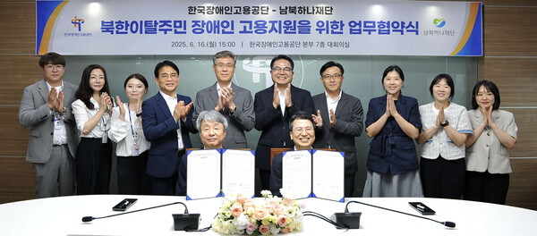 【에이블뉴스 이슬기 기자】한국장애인고용공단과 남북하나재단이 16일 한국장애인고용공단 대회의실에서 ‘북한이탈 장애인 고용지원을 위한 업무협약’을 맺고 장애인 채용 확대와 고용 안정을 위해 함께 노력하기로 했다.