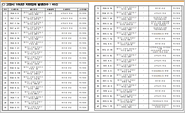 김미경 의원은 “고양시 재난대응담당관실 자료 및 일부 지역에 대한 지반조사 보고서에 따르면 최근 10년간 고양시 내 주요 도심과 교차로 등지에서 40건의 지반침하 사례가 발생하였으며, 그 원인은 굴착공사 부실, 하수관 손상, 지반약화, 지반침하, 다짐불량, 건축 부실시공 및 유지관리 미흡, 기타매설물 손상 등 단발성 사고가 아닌 구조적인 반복 양상으로 나타나고 있다”라며 “특히 2018년 12월 백석동 요진와이시티, 2019년 12월 백석동 알미공원 앞 도로, 2021년 12월 마두동 그랜드프라자, 2022년 8월 장항2동, 2023년 3월 킨텍스 사거리 GTX-A 공사 구간 등 다양한 지역에서 지반침하 사고가 발생했는데 이러한 사고들은 온수관 파열, 하수도 파손, 집중호우 등이 원인”이라고 지적했다.