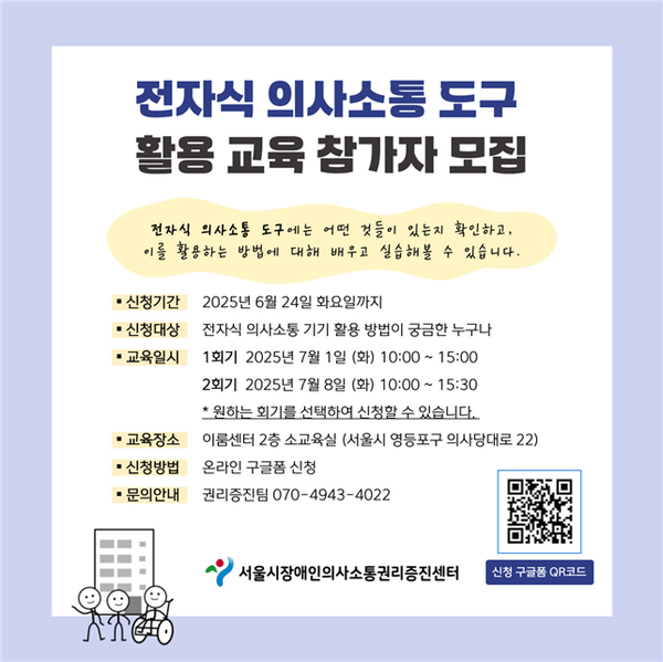 이번 교육은 장애인 당사자와 주변 지원 인력의 원활한 의사소통 지원 및 기기활용 어려움 해소를 위해 마련됐으며, 7월 1일(10시~15시), 7월 8일(10시~15시 30분) 서울 여의도 이룸센터에서 진행될 예정이다.