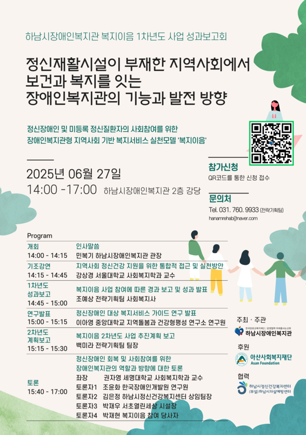 이번 성과보고회는 정신장애인 당사자와 가족, 정신건강·복지 관계자 등 약 60여 명이 참석할 예정이며, 참가 신청은 6월 20일까지 온라인 링크(https://forms.gle/ffzKPk5X3qxyFnfi8) 또는 QR코드를 통해 가능하다.