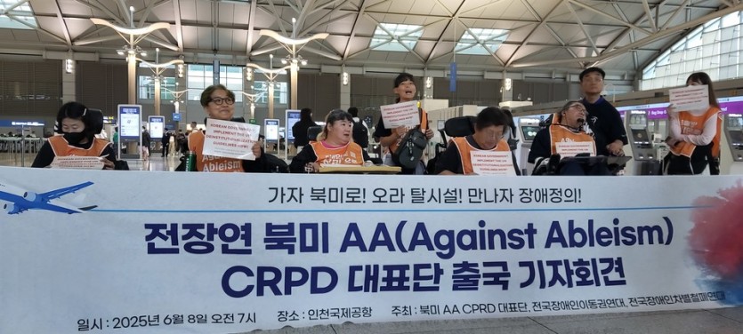 전국장애인차별철폐연대(아래 전장연)가 현지 시각으로 8일 오전 7시, 인천국제공항에서 기자회견을 열고, 미국·캐나다 투쟁을 위해 출국한다고 밝혔다.