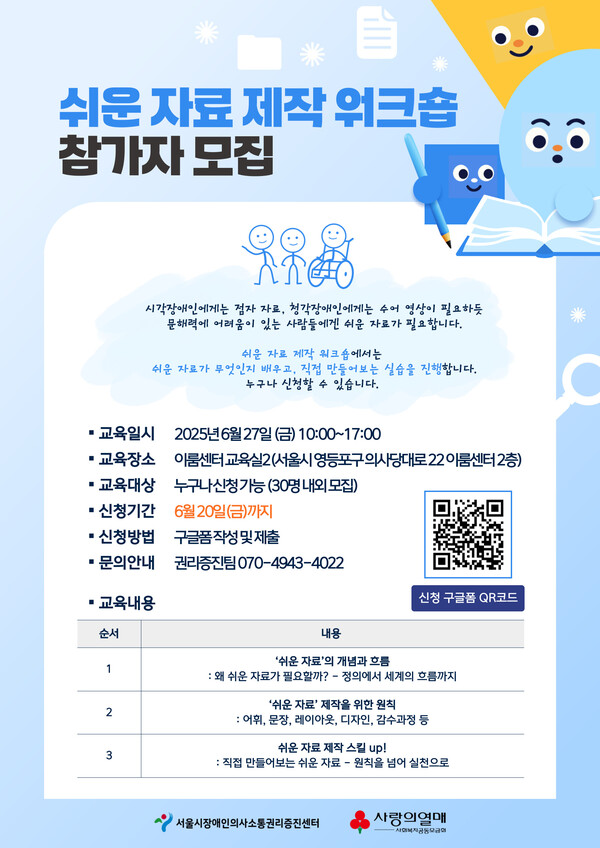이번 워크숍은 6월 27일 오전 10시부터 오후 5시까지 서울 여의도 이룸센터 2층 교육실2에서 열린다. 신청은 6월 20일까지 온라인(https://forms.gle/66xg6kZVRigEFtAS8) 또는 QR코드를 통해 가능하며, 자세한 문의는 센터 권리증진팀(070-4943-4022)으로 하면 된다.