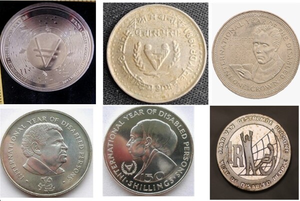 좌측 상단으로부터 시계방향으로 코르다노 암호화폐, 네팔의 주화, 맨섬의 주화, 예멘의 장애인의 해 기념 주화, 소말리아 장애인의 해 기념 주화, 남아공 장애인의 해 기념 주화. ©서인환