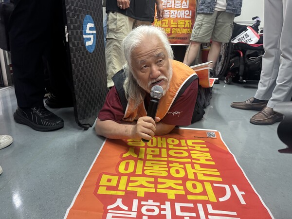 전장연은 오전 8시부터 이 대통령의 취임식이 열리는 국회의사당역까지 “장애인도 시민으로 이동하는 민주주의”를 외치며 지하철 포체투지를 벌이고 있다. 전장연은 “이재명 대통령의 취임을 축하한다”며 “ 새 시대에는 장애인도 이동하고 교육받고 노동하며 감옥 같은 거주시설이 아니라 지역사회에서 평등하게 잘 살아갈 수 있었으면 좋겠다”고 바람을 전했다.