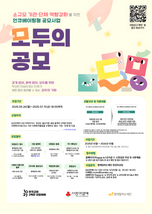 ‘모두의 공모’ 사업은 열악한 사회복지 현장에서 묵묵히 헌신해 온 소규모 기관과 단체를 위해 10.27 한국교회 연합예배와 사랑의열매가 함께 뜻을 모아 기획했다.
