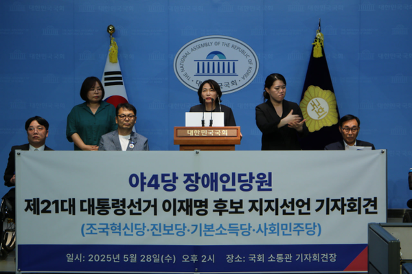 【에이블뉴스 이슬기 기자】야4당(조국혁신당·진보당·기본소득당·사회민주당) 장애인당원이 28일 국회 소통관에서 기자회견을 열고 이재명 민주당 대통령 후보 지지를 선언했다.