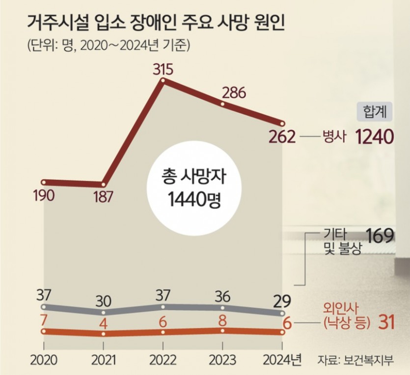 전체 사망자 중 대다수가 질병으로 목숨을 잃었다. 병사로 사망한 장애인은 1240명으로, 86.1%를 차지했다. 질식, 낙상 등 외부 요인으로 인한 ‘외인사’는 31명(2.1%), 사인 불명의 ‘기타 및 불상’은 169명(11.7%)이었다.