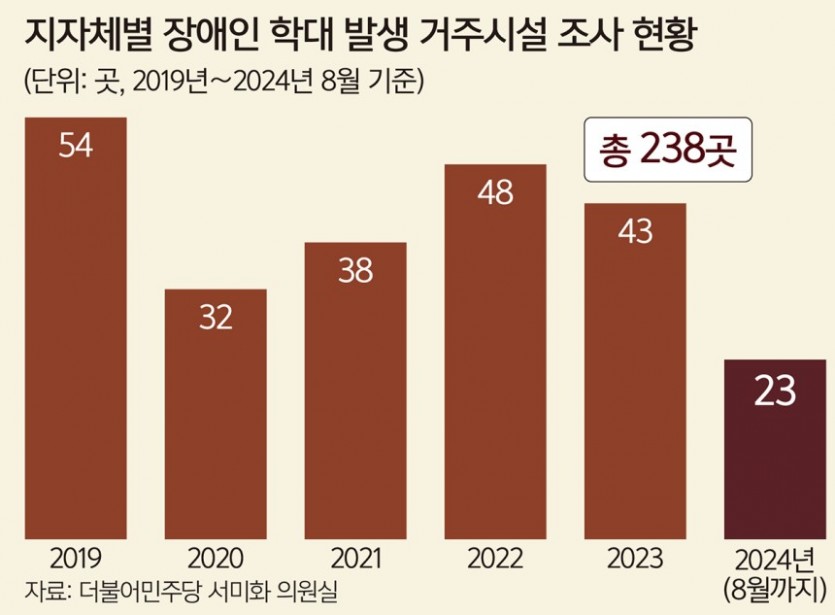 본지가 국회 보건복지위원회 소속 더불어민주당 서미화 의원실을 통해 확보한 ‘최근 5년(2019년~2024년 8월) 지자체별 장애인 학대 발생시설 조사 결과 통보 현황’ 자료에 따르면 장애인권익옹호기관 조사 결과 학대로 판명된 시설 수는 238곳(중복 포함)에 달한다. 2020년 경기 가평의 한 중증장애인 거주시설에서는 거주인이 말을 듣지 않거나 대소변을 자주 본다는 이유로 폭력을 가하고 밥양을 줄이는 식으로 학대를 저질렀다. 경기 남양주의 거주시설에서는 수년간 신체적?정서적 학대와 성폭력까지 발생하는 인권 침해 문제가 반복돼 시설 폐쇄를 앞두고 있다.