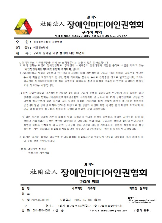 권 회장은 “구리시의 수많은 장애인들이 차별받지 않고 안전하게 살아갈 권리를 되찾을 수 있도록, 지역사회와 경찰이 책임감 있는 대응을 해줄 것”을 호소했다.