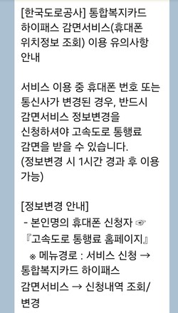 하지만 최근 한국도로공사에서 발송한 문자 하나가 고개를 갸우뚱하게 만듭니다. 하이패스 감면 서비스를 이용하려면 휴대폰 본인 인증과 함께 '위치정보 제공'에 동의해야 한다는 안내를 받았습니다.