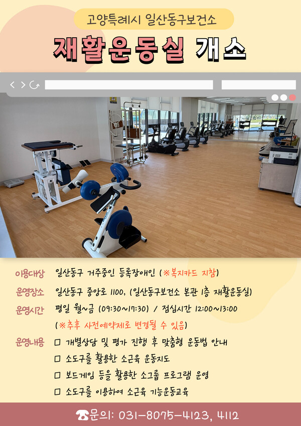 일산동구보건소 관계자는 “재활운동실 개소를 통해 장애인의 건강관리 능력 향상과 자립 생활 지원을 한층 강화할 수 있게 됐다”며 “앞으로도 지역사회 중심의 재활서비스를 지속 확대해 나갈 계획”이라고 말했다.