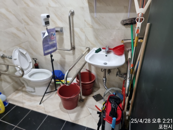 청소도구가 가득한 장애인화장실 모습.ⓒ포천나눔의집장애인자립생활센터