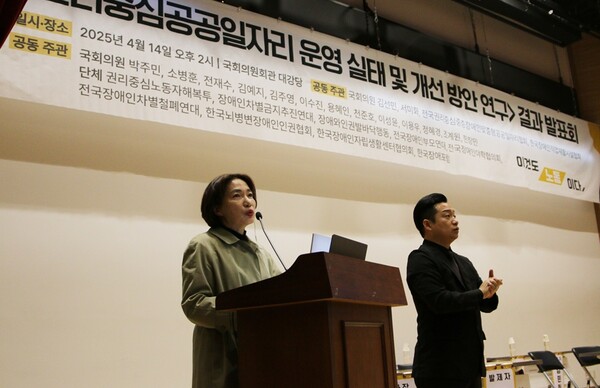 이날 발표회는 전국권리중심중증장애인맞춤형공공일자리협회 박경석 대표가 좌장을 맡았고 연구를 총괄한 중부대학교 김기룡 교수가 연구 결과를 발표했다. 이어진 토론에서는 한국장애인고용공단 고용개발원 김용탁 선임연구원과 경기도장애인복지종합지원센터 누림의 이정주 센터장 보건복지부 장애인자립기반과 김민정 과장이 토론에 참여했다.