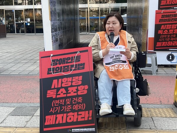 하지만 판결 이후 바뀐 것은 하나도 없다. 장애인등편의법 시행령에는 여전히 50㎡(약 15평) 이상의 시설에만 편의시설을 의무화했다. 그마저도 법 시행 전 건물에는 적용되지 않아, 여전히 장애인은 편의점, 식당에 들어가지 못하는 현실이다. 장애계는 이 독소조항을 폐지해달라고 줄기차게 외쳐왔다.