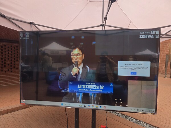 2일 서울 중구 서소문성지역사박물관에서 열린 세계 자폐인의 날 기념식 도중 야외에 설치된 스크린이 정상적으로 작동하지 않고 있다. ⓒ장지용
