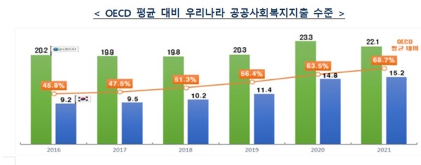 또한 2011년부터 2021년까지의 공공사회복지지출 증가율은 연평균 12.2%로, OECD 평균(5.7%)의 약 2배에 이르는 빠른 증가세를 보였다.