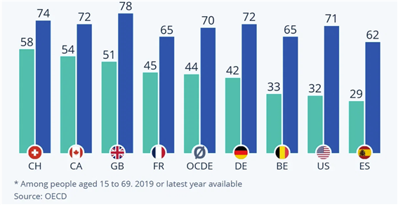 그래서인지 캐나다의 장애인 고용은 OECD 국가 중 항상 선두를 지키고 있다. 2022년 OECD 통계로 보면 캐나다 장애인고용률은 54%로 이며 국가 전체 고용률 72%에 비춰보면 18%포인트 정도 차이가 난다. 이는 OECD 평균 격차 27%에 비하면 현저히 낮은 수준임을 알 수 있다.