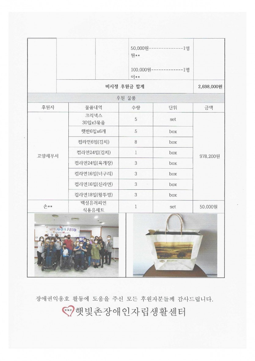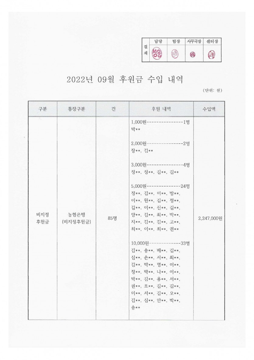 2022년 9월 후원금 수입 내역 보고 페이지 정보 작성자 햇빛촌 조회 1,611회 작성일 22-11-08 15:35 본문 2022년 9월 후원금 수입 내역 보고 목록 이전글2022년 10월 후원금 수입 내역 보고 22.11.08 다음글2022년 8월 후원금 수입 내역 보고 22.11.08 댓글목록 댓글목록 등록된 댓글이 없습니다.