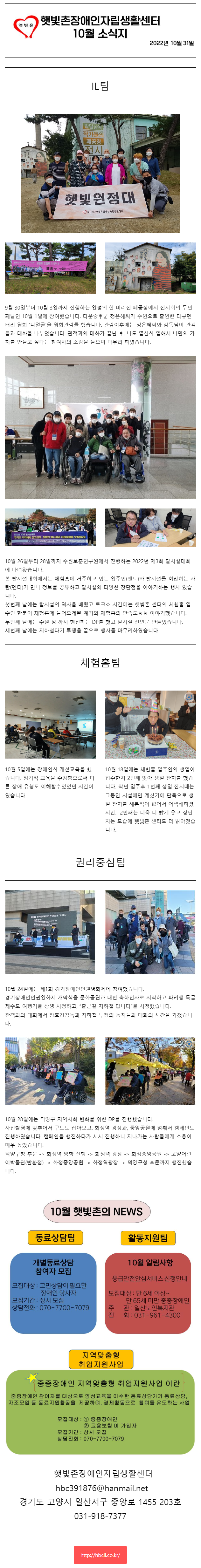 2022년 10월 햇빛촌 소식지 페이지 정보 작성자 햇빛촌 조회 1,680회 작성일 22-11-14 09:27 본문 2022년 10월 햇빛촌 소식지입니다 목록 이전글권리중심 중증장애인 맞춤형 공공일자리 전국순회(경기)취업박람회 안내 22.11.23 다음글2022년 10월 후원금 수입 내역 보고 22.11.08 댓글목록 댓글목록 등록된 댓글이 없습니다.