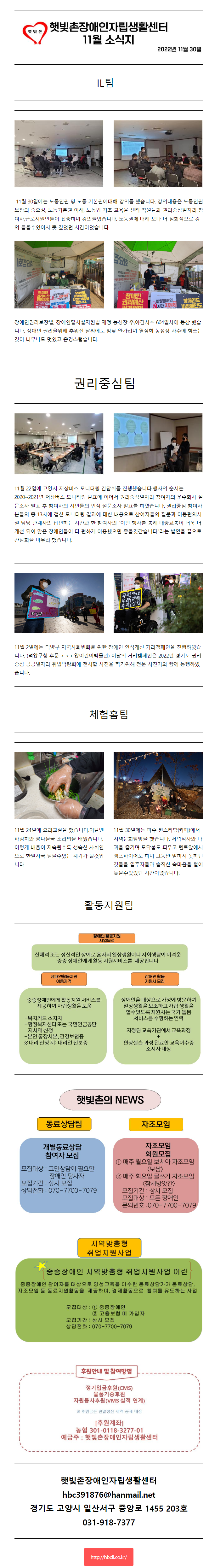 2022년 11월 햇빛촌 소식지 페이지 정보 작성자 햇빛촌 조회 1,699회 작성일 22-12-08 17:48 본문 2022년 11월 햇빛촌 소식지입니다 목록 이전글2022년 햇빛촌 통합운영위원회 개최 공지 22.12.09 다음글권리중심 중증장애인 맞춤형 공공일자리 전국순회(경기)취업박람회 안내 22.11.23 댓글목록 댓글목록 등록된 댓글이 없습니다.