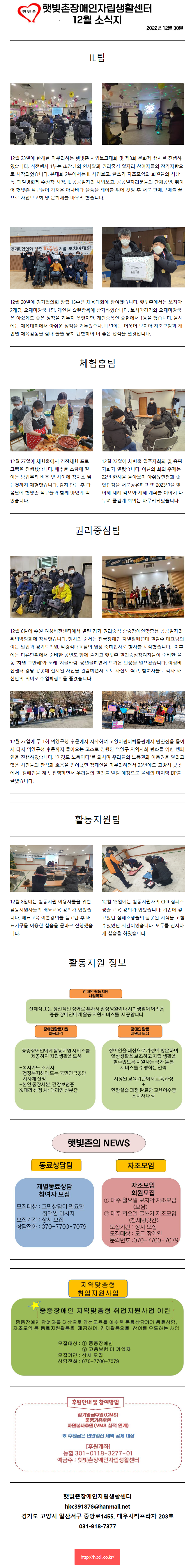 2022년 12월 햇빛촌 소식지 페이지 정보 작성자 햇빛촌 조회 1,704회 작성일 22-12-30 16:18 본문 2022년 12월 햇빛촌 소식지입니다 목록 이전글미술 강사모집 23.01.10 다음글2022년 햇빛촌 사업보고대회 및 제3회 문화제 안내 22.12.21 댓글목록 댓글목록 등록된 댓글이 없습니다.