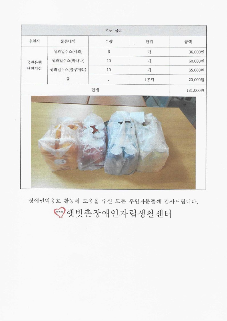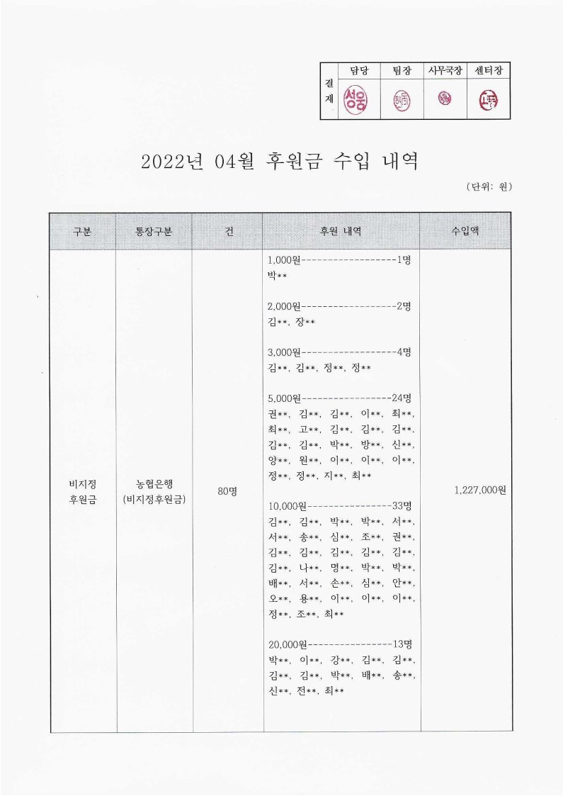 2022년 4월 후원금 수입 내역 보고 페이지 정보 작성자 햇빛촌 조회 1,739회 작성일 22-06-07 20:36 본문 2022년 4월 후원금 수입 내역 보고 목록 이전글2022년 5월 후원금 수입 내역 보고 22.06.07 다음글2022년 3월 후원금 수입 내역 보고 22.06.07 댓글목록 댓글목록 등록된 댓글이 없습니다.