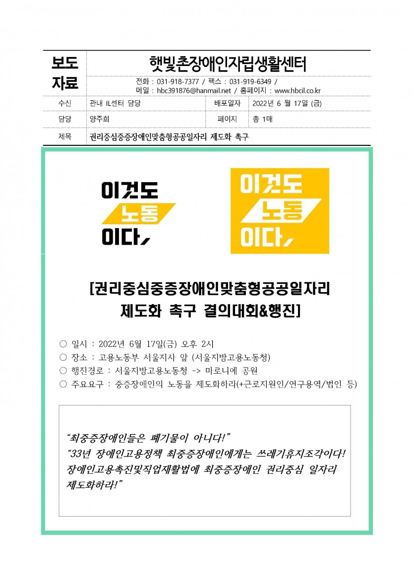 권리중심중증장애인맞춤형공공일자리 제도화 촉구 결의대회&행진 페이지 정보 작성자 햇빛촌 조회 1,769회 작성일 22-06-17 09:40 본문 권리중심중증장애인맞춤형공공일자리 제도화 촉구 결의대회&행진 목록 이전글햇빛촌 제3차 IL 운영위원회 개최 공지 22.07.21 다음글2022년 5월 후원금 수입 내역 보고 22.06.07 댓글목록 댓글목록 등록된 댓글이 없습니다.