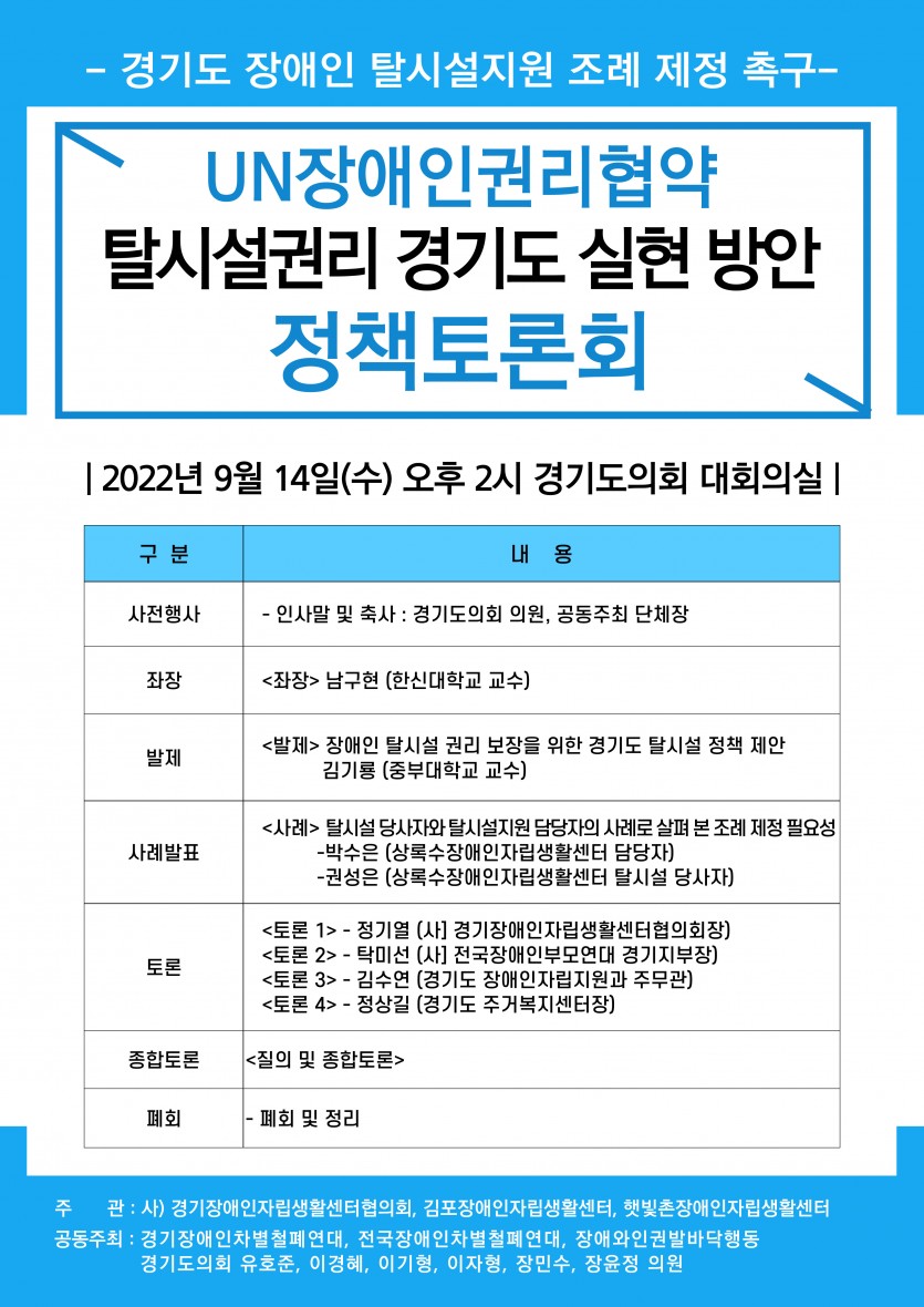 UN장애인권리협약 탈시설권리 경기도 실현방안 정책토론회 개최안내 페이지 정보 작성자 햇빛촌 조회 1,707회 작성일 22-09-14 08:45 본문 UN장애인권리협약 탈시설권리 경기도 실현방안 정책토론회 개최안내 목록 이전글2022년 햇빛촌 장애인권주간 행사 개최 안내 22.09.15 다음글햇빛촌 소식지 구독신청 페이지 22.08.10 댓글목록 댓글목록 등록된 댓글이 없습니다.