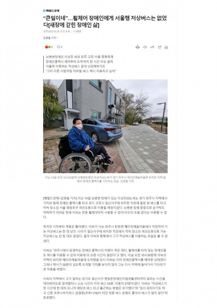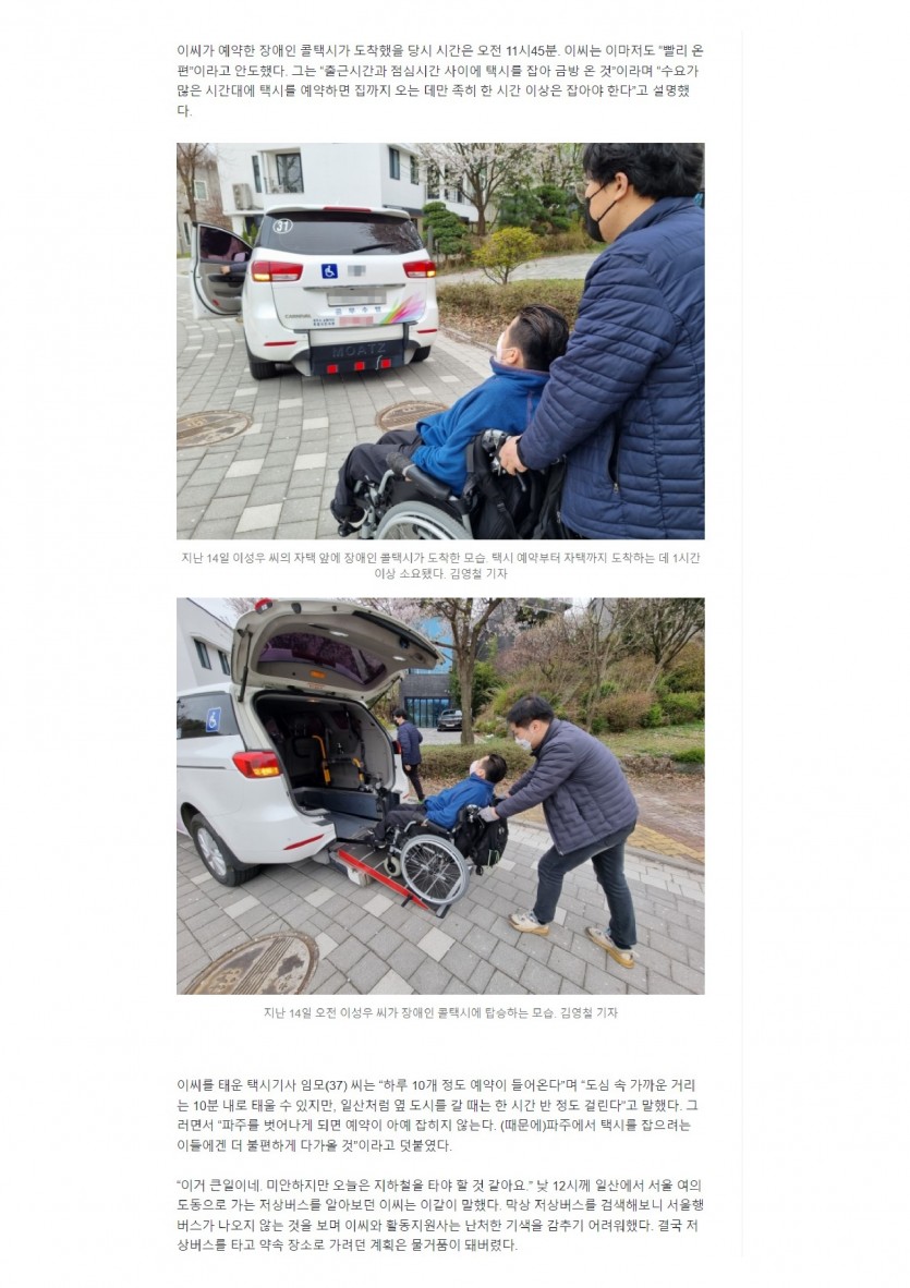 4/13 햇빛촌 센터 이성우 활동가의 이동권 관련 동행 취재 기사입니다. <헤럴드경제 기사> 페이지 정보 작성자 햇빛촌 조회 2,079회 작성일 22-05-04 13:23 본문 지난 4월 13일 이동권 관련하여 이성우 활동가가 동행 취재를 다녀왔습니다. 출처 : https://n.news.naver.com/article/016/0001980068 목록 이전글2022년 햇빛촌 3월 소식지 22.05.04 다음글2022년 햇빛촌 2월 소식지 22.05.04 댓글목록 댓글목록 등록된 댓글이 없습니다.