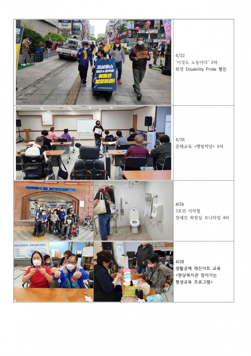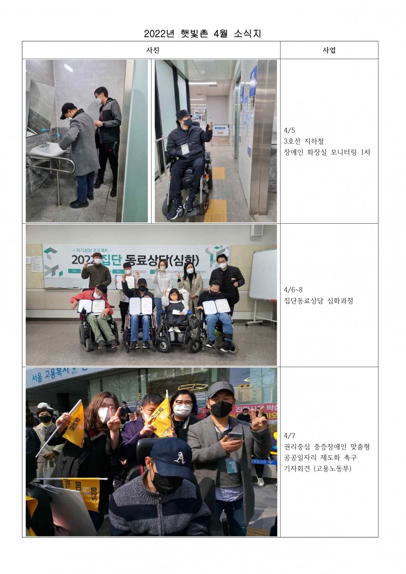2022년 햇빛촌 4월 소식지 페이지 정보 작성자 햇빛촌 조회 1,894회 작성일 22-05-04 17:53 본문 2022년 햇빛촌 4월 소식지 목록 이전글2022년 발달장애인 집단동료상담 참여자를 모집합니다. 22.05.11 다음글2022년 햇빛촌 3월 소식지 22.05.04 댓글목록 댓글목록 등록된 댓글이 없습니다.