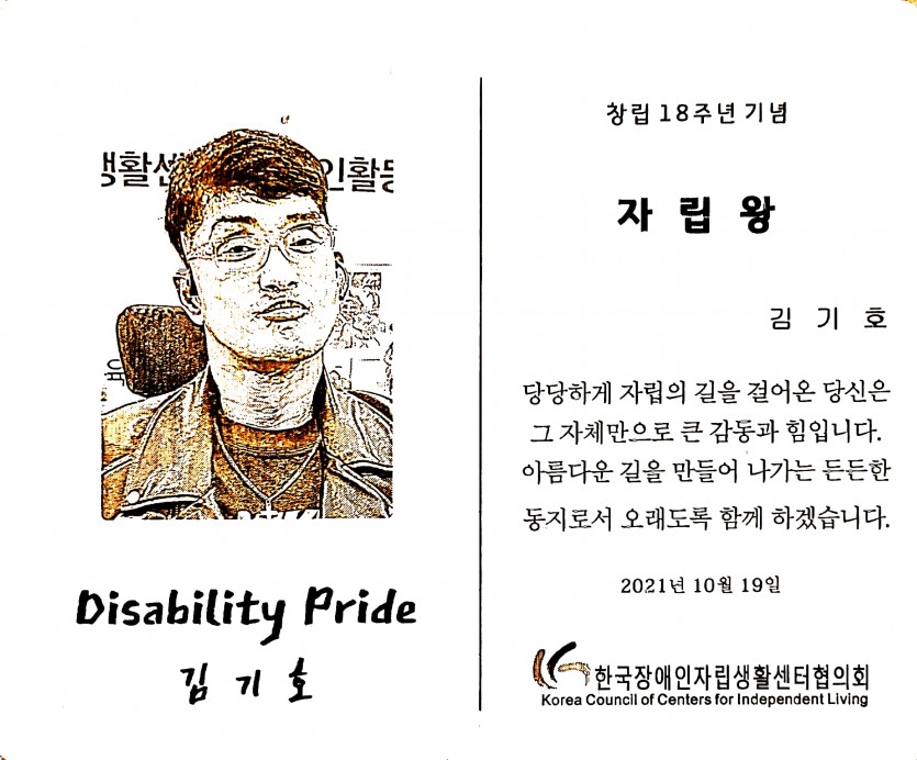 2021년 10월 19일 한국장애인자립생활센터협의회 창립 18주년 기념식 에서 햇빛촌센터의 김기호 활동가가 자립왕 시상을 하였습니다.