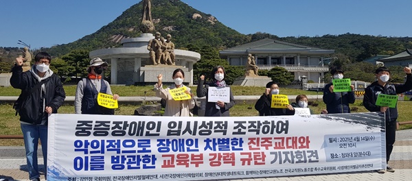 전국장애인차별철폐연대, 장애인차별금지추진연대, 전국장애인야학협의회, 장애인권대학생네트워크, 함께하는장애인교원노조, 전국교직원노동조합 특수교육위원회 등 6개 단체가 해당 국립교대 및 교육부에 사과 및 재발 방지 대책을 요구하기 위해 열린민주당 강민정 원내대표와 함께 2021년 4월 14일 청와대 분수대 앞에서 기자회견을 가진 모습. ⓒ에이블뉴스DB 에이블포토로 보기▲ 전국장애인차별철폐연대, 장애인차별금지추진연대, 전국장애인야학협의회, 장애인권대학생네트워크, 함께하는장애인교원노조, 전국교직원노동조합 특수교육위원회 등 6개 단체가 해당 국립교대 및 교육부에 사과 및 재발 방지 대책을 요구하기 위해 열린민주당 강민정 원내대표와 함께 2021년 4월 14일 청와대 분수대 앞에서 기자회견을 가진 모습. ⓒ에이블뉴스DB