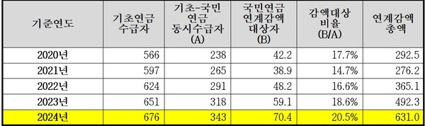 연도별 추이를 보면 동시수급자와 감액대상자 모두 증가하는 가운데 감액 총액도 함께 확대되는 흐름이 나타났다. 특히 감액대상 비율은 2024년 20.5%로, 동시수급자 5명 중 1명은 기초연금이 깎인 것으로 확인됐다.