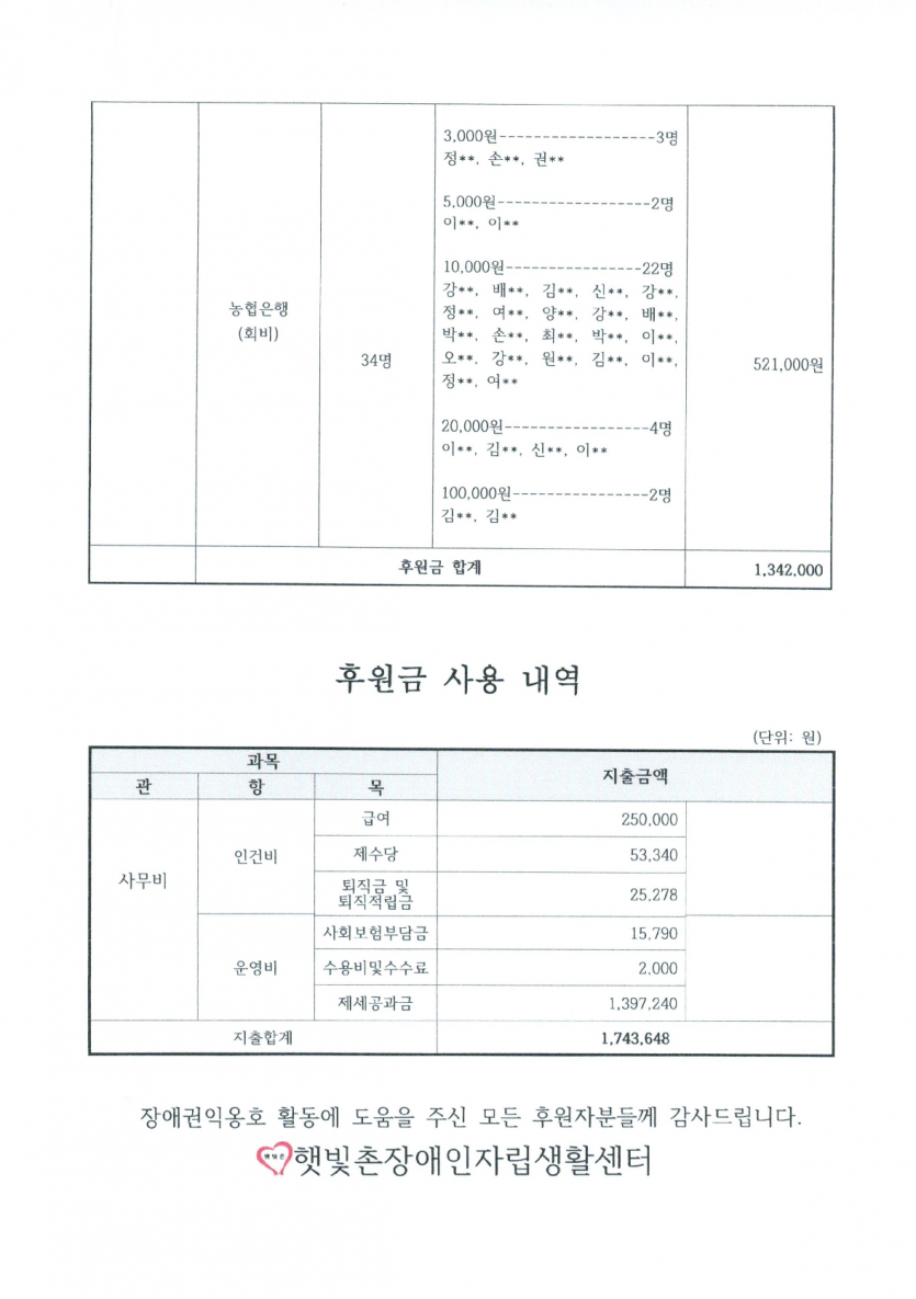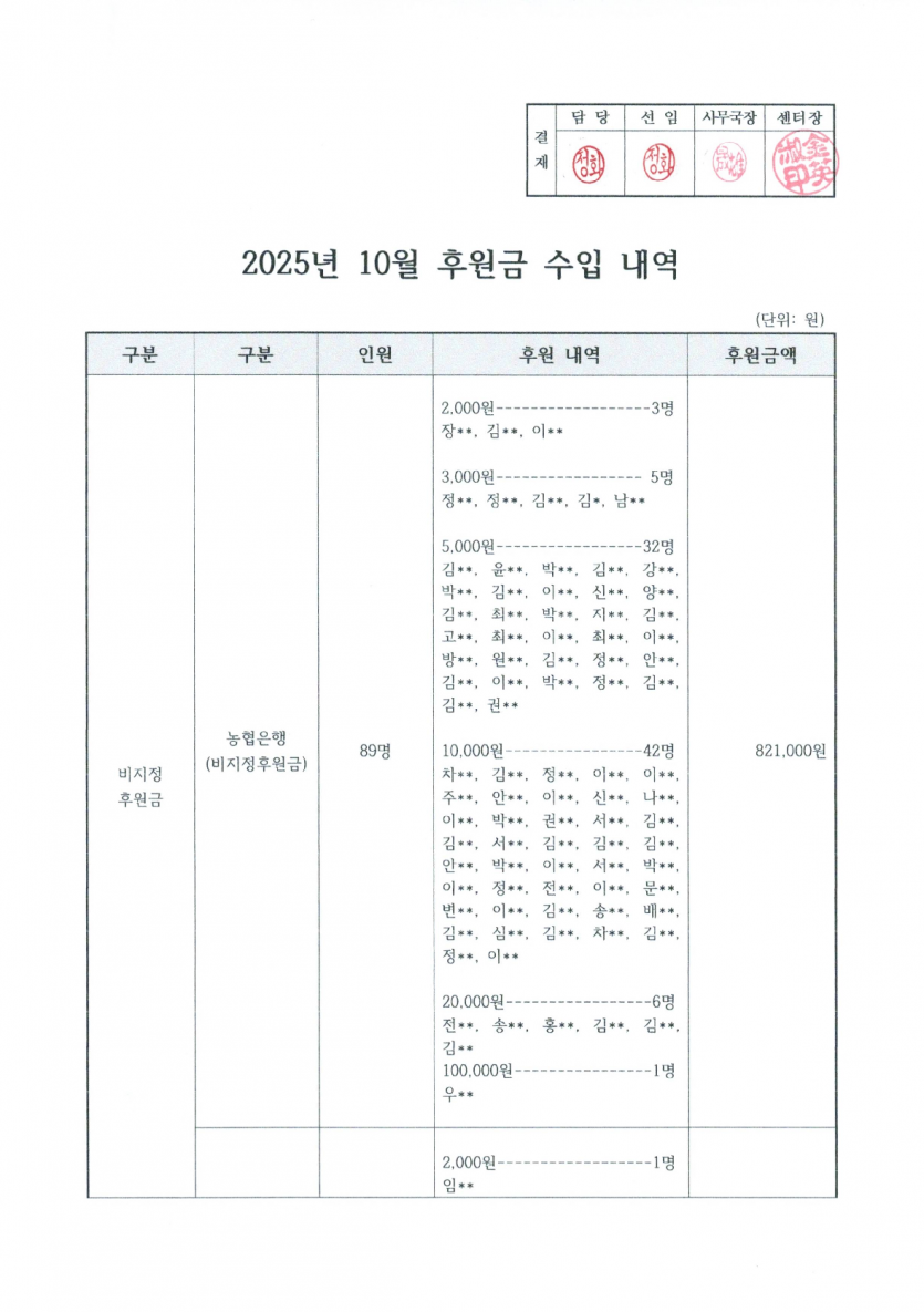 2025년 10월 후원금 수입, 사용 내역 보고 페이지 정보 작성자 햇빛촌 조회 665회 작성일 25-11-19 14:25 본문 2025년 10월 후원금 수입, 사용 내역 보고 목록 이전글2025 더불어 문화체험 참여자 모집 안내 25.12.04 다음글2025년 10월 햇빛촌 소식지 25.11.11 댓글목록 댓글목록 등록된 댓글이 없습니다.