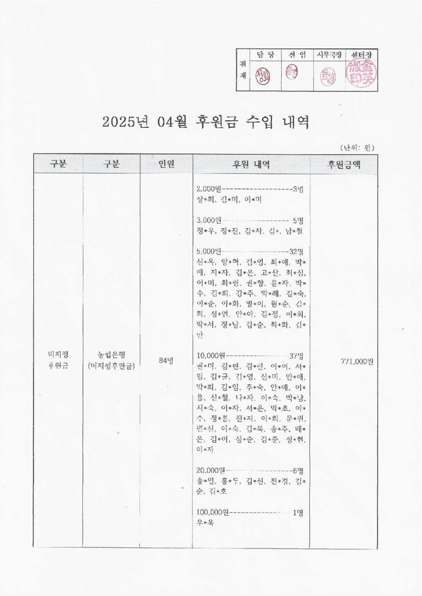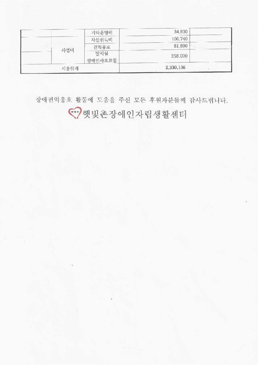 2025년 4월 후원금 수입, 사용내역 보고 페이지 정보 작성자 햇빛촌 조회 906회 작성일 25-05-27 14:41 본문 2025년 4월 후원금 수입, 사용내역 보고 목록 이전글2025 발달장애 동료상담 힐링캠프 참여자 모집 안내 25.06.04 다음글2025년 권리중심 중증장애인맞춤형 공공일자리 참여자 추가모집 25.05.16 댓글목록 댓글목록 등록된 댓글이 없습니다.