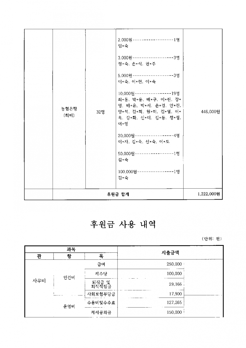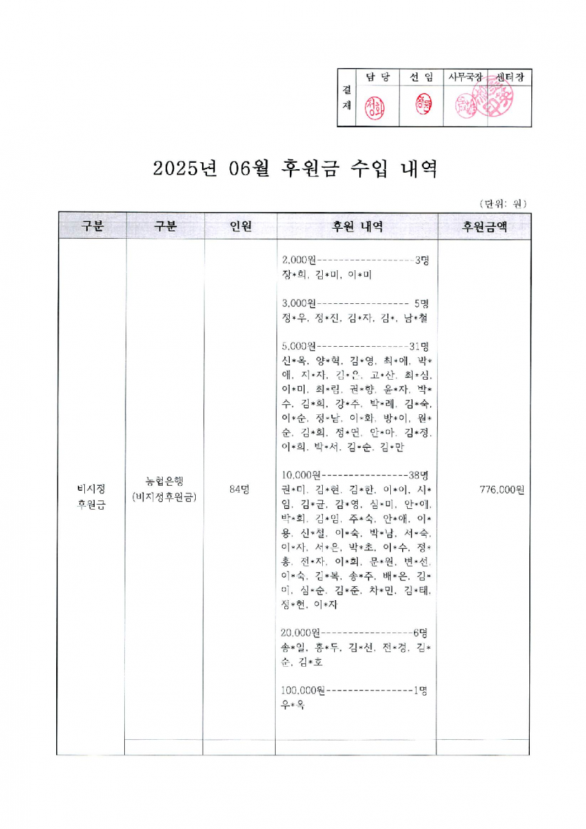 2025년 6월 후원금 수입, 사용 내역 보고 페이지 정보 작성자 햇빛촌 조회 866회 작성일 25-07-31 11:04 본문 2025년 6월 후원금 수입, 사용내역 보고 목록 이전글2025년 7월 햇빛촌 소식지 25.08.09 다음글2025년 6월 햇빛촌 소식지 25.07.09 댓글목록 댓글목록 등록된 댓글이 없습니다.