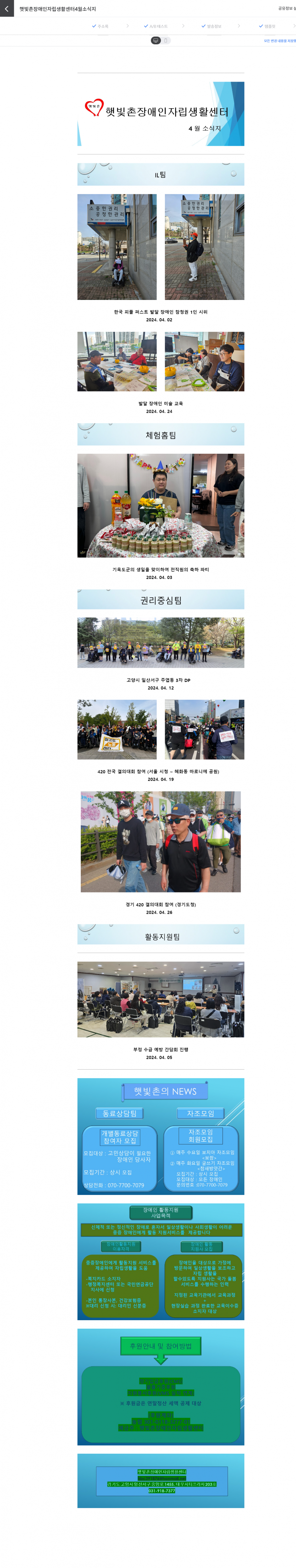 2024년 4월 햇빛촌 소식지 페이지 정보 작성자 햇빛촌 조회 1,504회 작성일 24-07-20 18:33 본문 2024년 4월 햇빛촌 소식지 목록 이전글2024년 5월 햇빛촌 소식지 24.07.21 다음글2024년 권리중심 중증장애인 맞춤형 공공일자리 참여자 추가 모집 24.07.04 댓글목록 댓글목록 등록된 댓글이 없습니다.