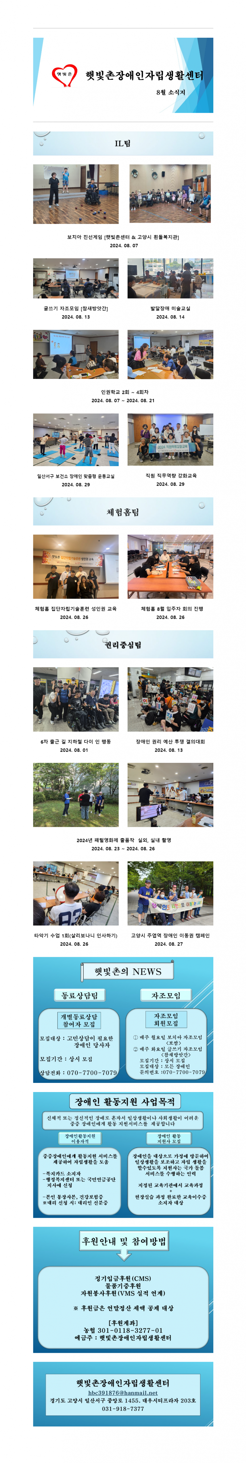 2024년 8월 햇빛촌 소식지 페이지 정보 작성자 햇빛촌 조회 1,412회 작성일 24-09-13 18:58 본문 2024년 8월 햇빛촌 소식지 목록 이전글2024년 8월 후원금 수입, 사용 내역 24.09.26 다음글2024년 7월 후원금 수입, 사용 내역 보고 24.08.27 댓글목록 댓글목록 등록된 댓글이 없습니다.