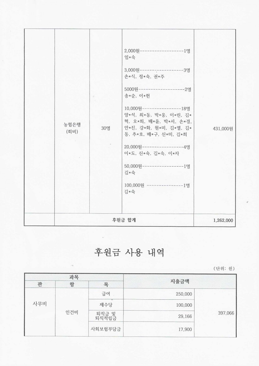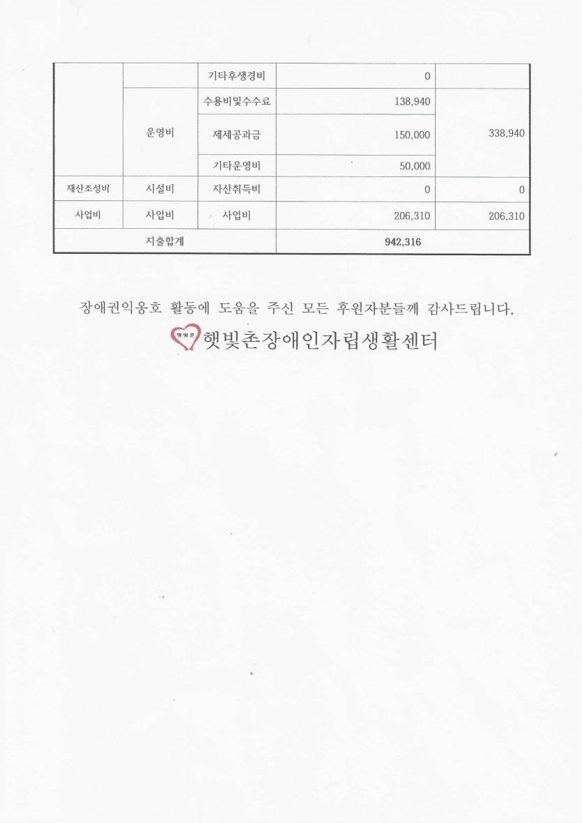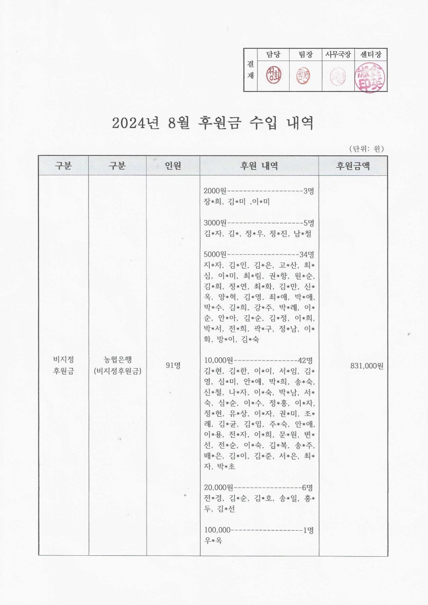 2024년 8월 후원금 수입, 사용 내역 페이지 정보 작성자 햇빛촌 조회 1,448회 작성일 24-09-26 16:49 본문 2024년 8월 후원금 수입, 사용 내역 목록 이전글2024년 9월 햇빛촌 소식지 24.10.11 다음글2024년 8월 햇빛촌 소식지 24.09.13 댓글목록 댓글목록 등록된 댓글이 없습니다.