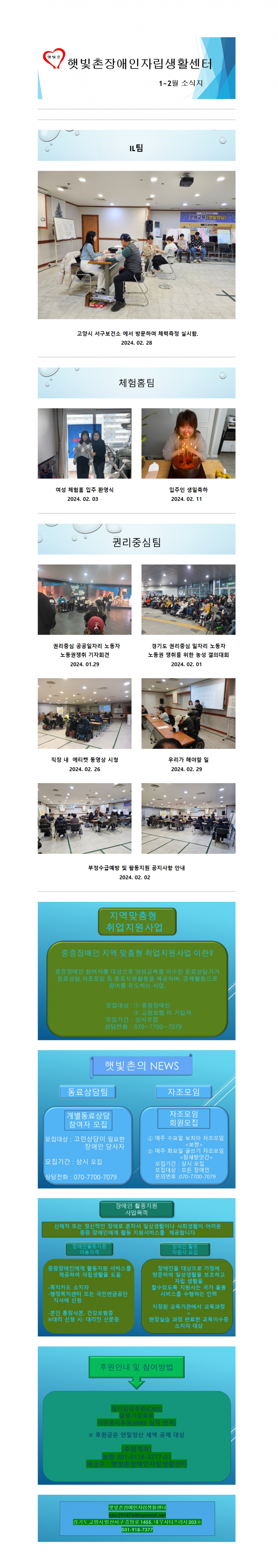 2024년 1~2월 햇빛촌 소식지 페이지 정보 작성자 햇빛촌 조회 1,594회 작성일 24-03-21 13:39 본문 2024년 1~2월 햇빛촌 소식지 목록 이전글2023 햇빛촌 결산공고 24.03.27 다음글햇빛촌 소장 선거(보궐) 후보 등록 공고 24.02.21 댓글목록 댓글목록 등록된 댓글이 없습니다.